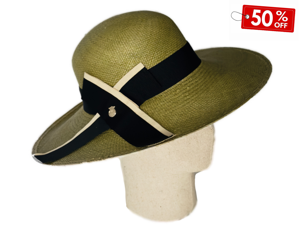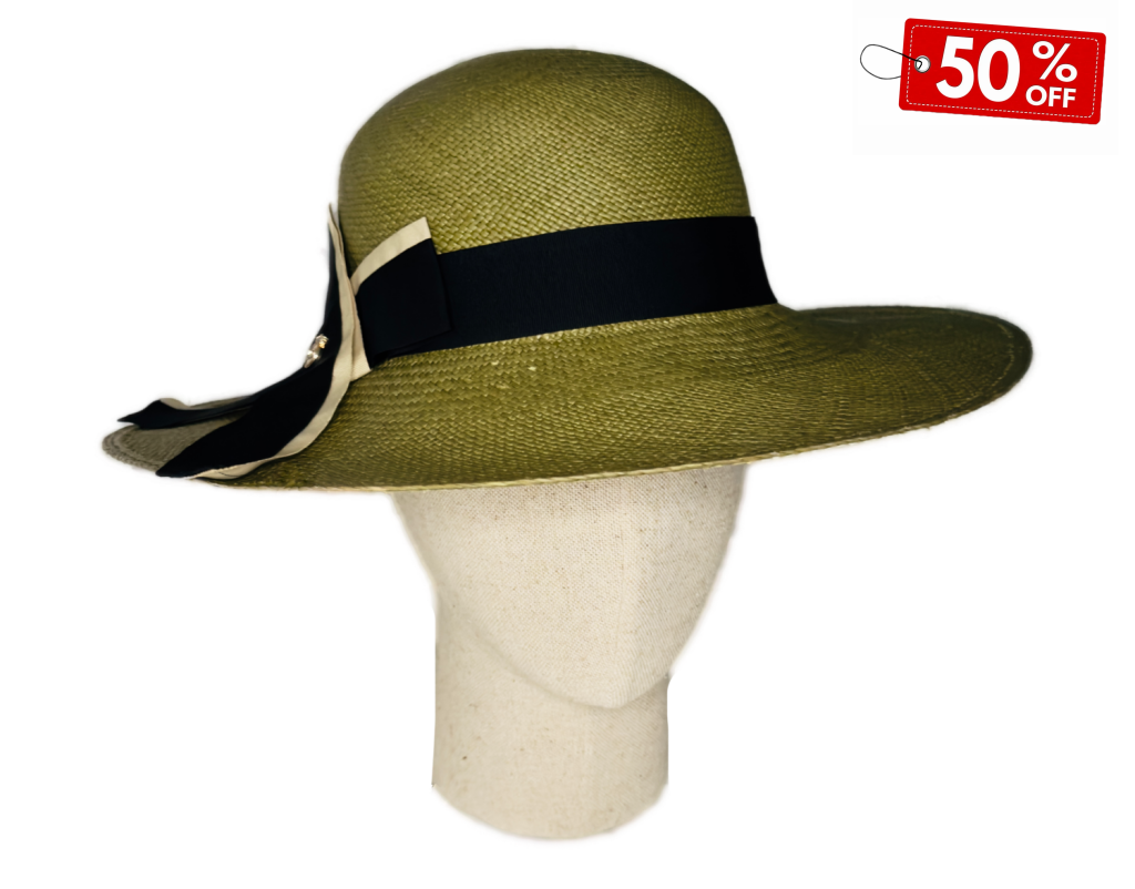- Hatband: Black grosgrain ribbon with a black and beige bow and our iconic golden pin fixed on the side.