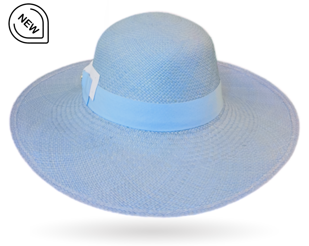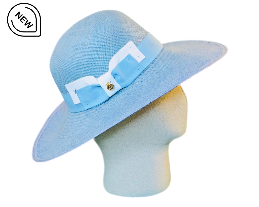 • Hatband: Light blue grosgrain ribbon with a double white and light blue bow with our iconic golden pin fixed on the side.