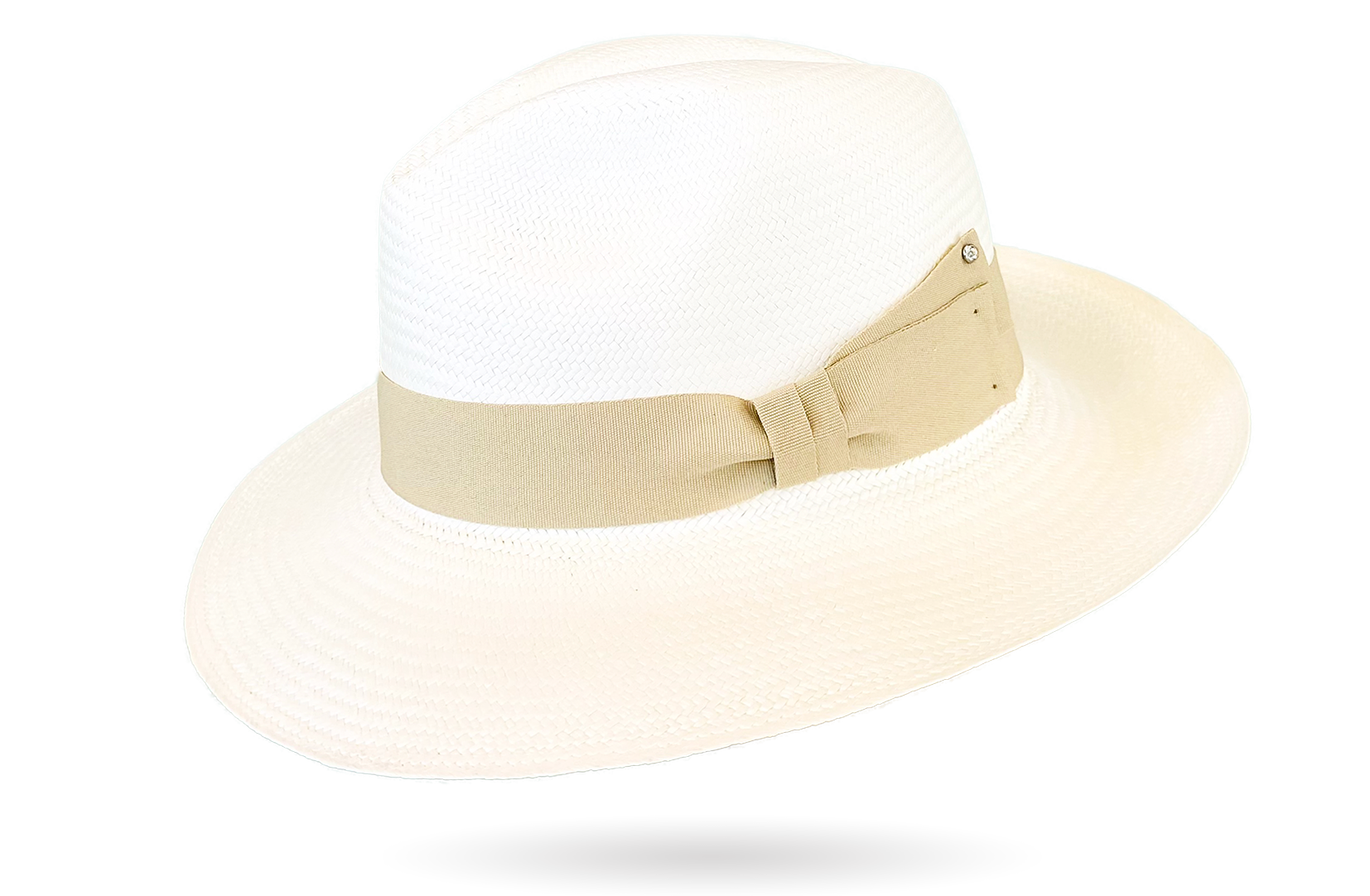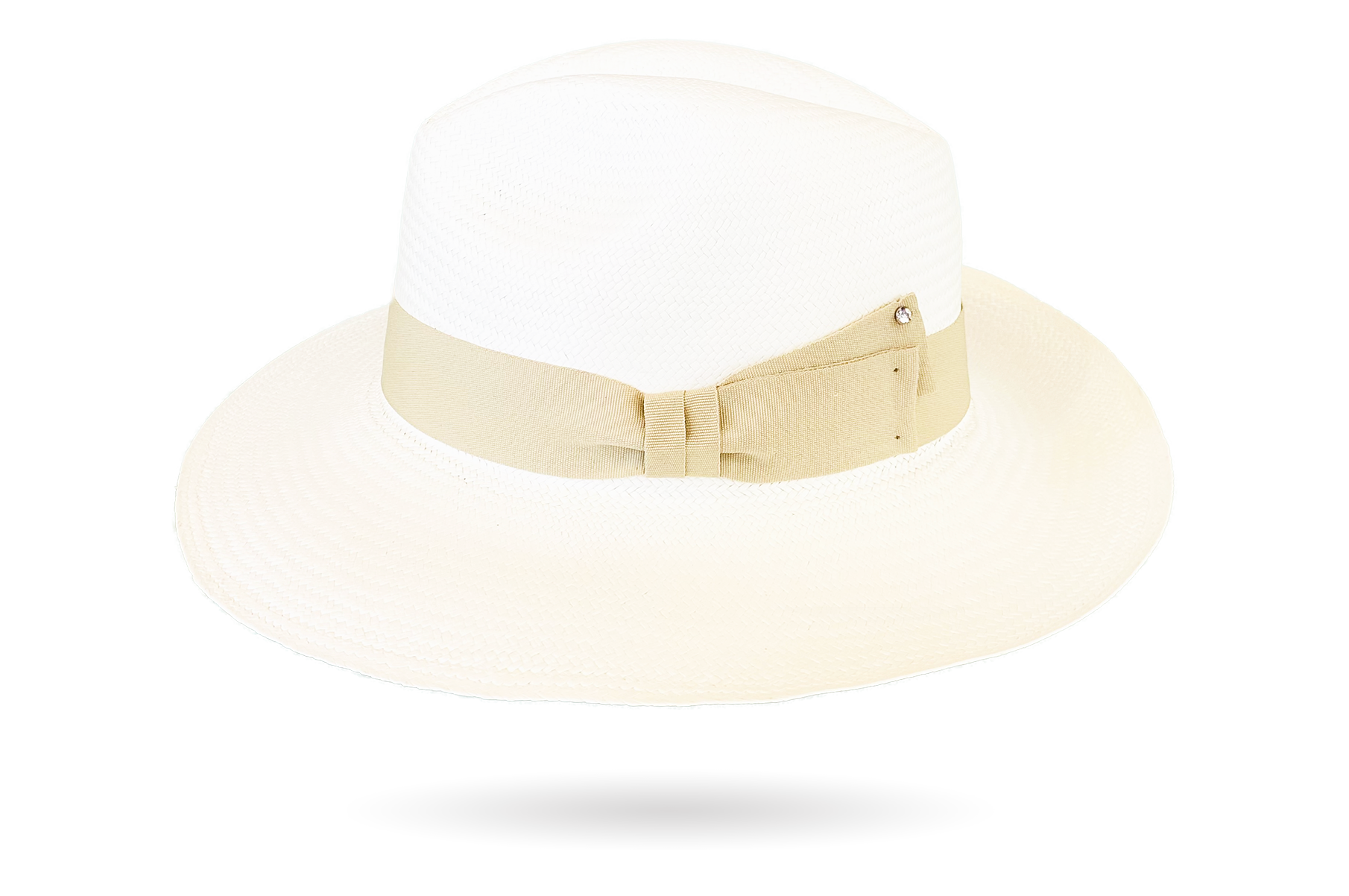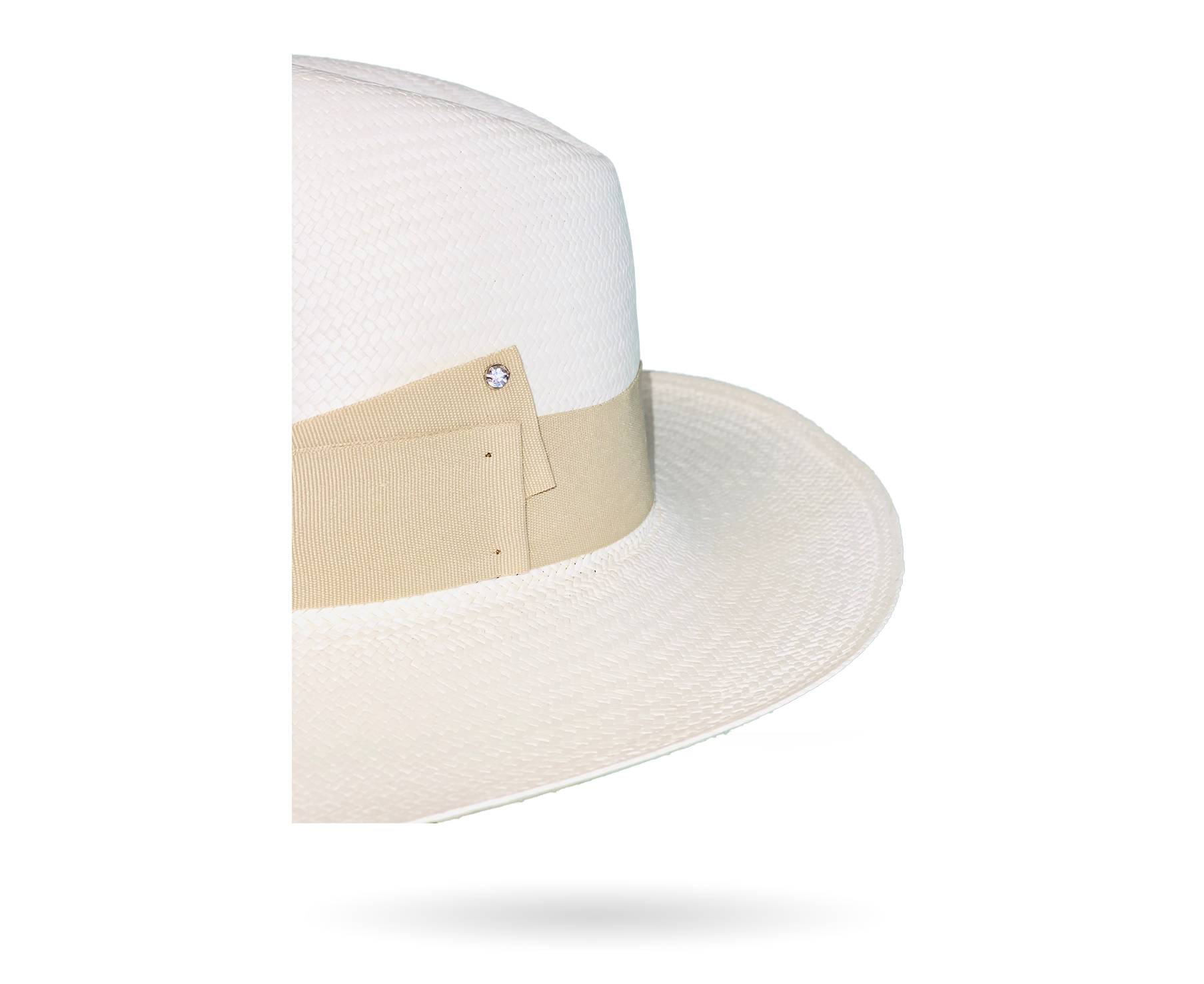 Hatband: Ivory grosgrain ribbon with a rhinestone crystal fixed on the side that adds distinction to any summer outfit